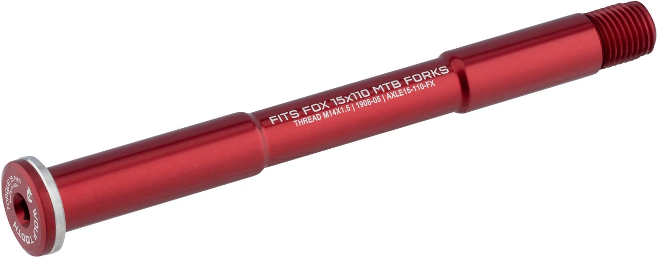Specifications:Over Locknut Dimension:Front: 110 mmAxle Diameter:15 mmTechnical Information:Use:Front: 15 x 110 mmType:thru-axleAxle Material:aluminium (7075-T6)Axle Length:155 mmNominal Diameter:M14Thread Pitch:1.5Thread Length:15 mmCompatibility:Fox Racing Shox 15 mm suspension forks (Boost)Features:similar to the Fox Kabolt axle, but with more colour options and Wolf Tooth brandingwith plated steel washerfor 6 mm hex tooltightening torque 12 – 15 NmMade in the USA
