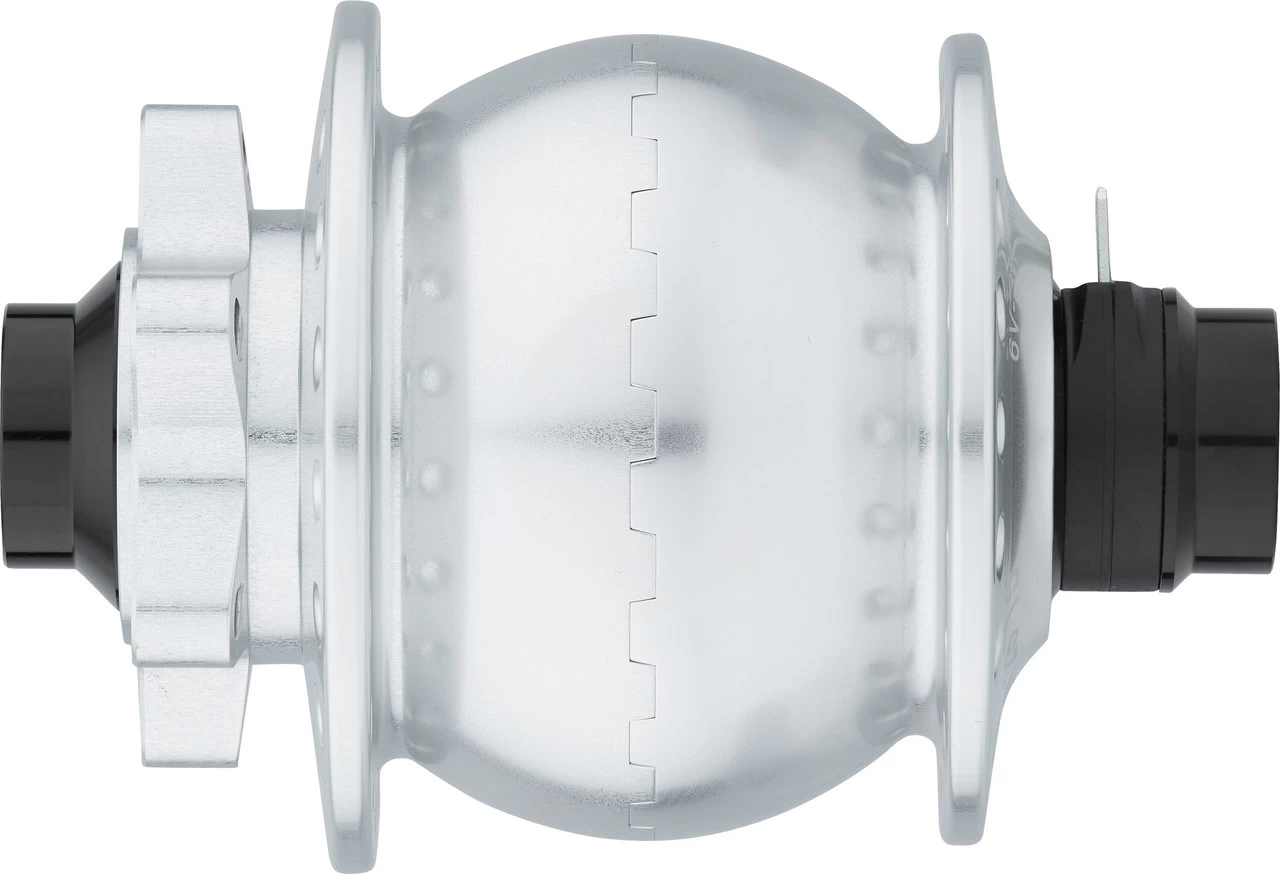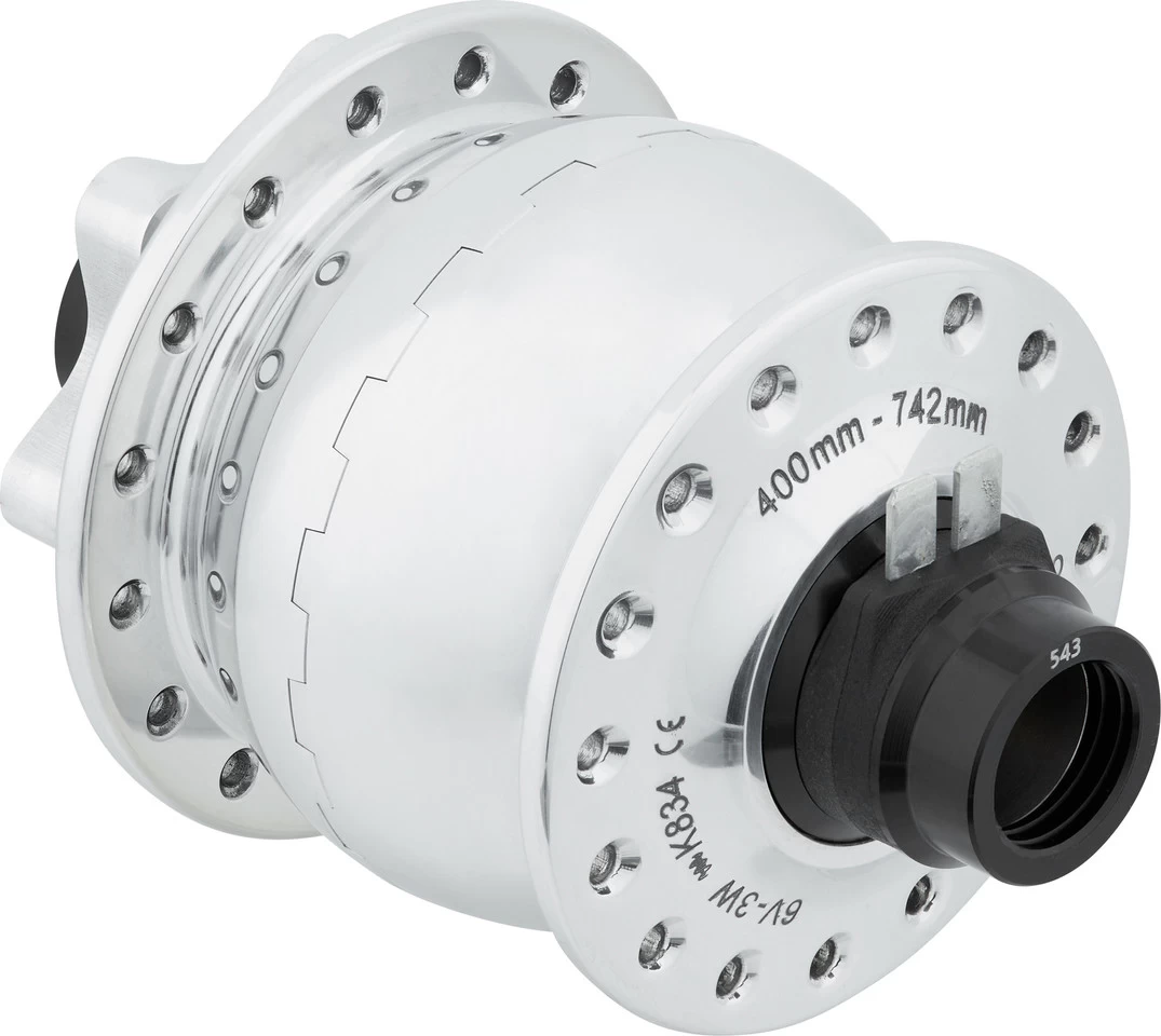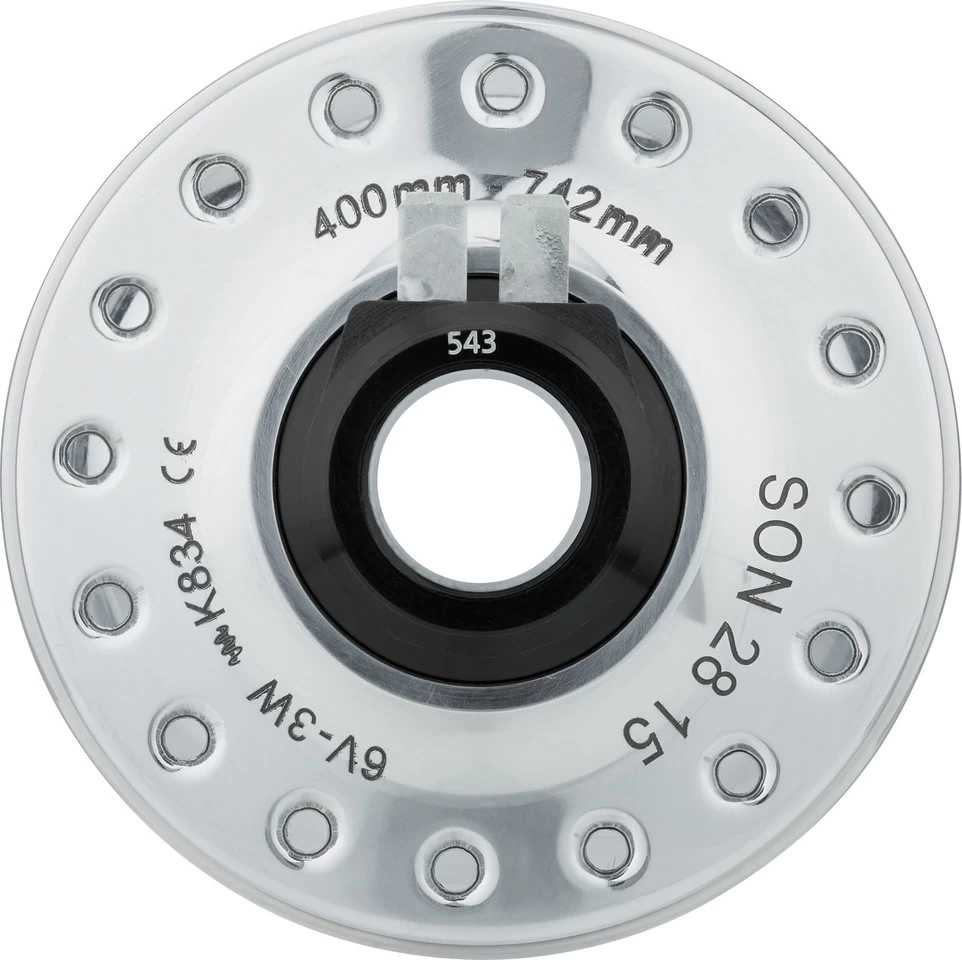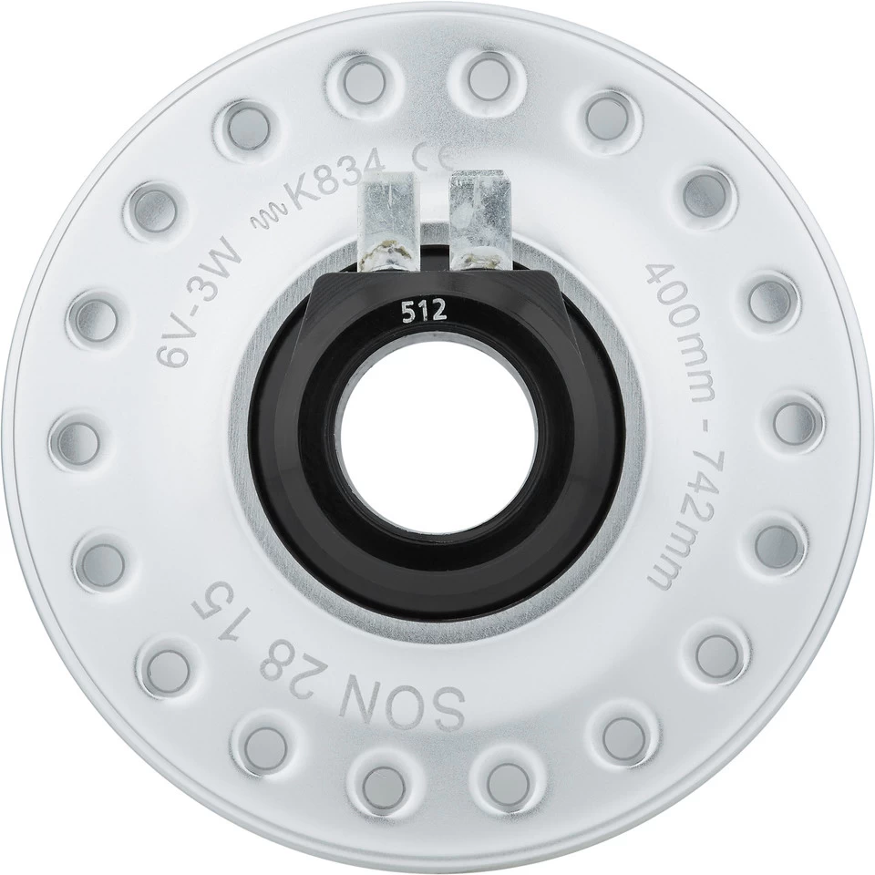 Specifications:Output:6V/3W (according to StVZO)Efficiency:65% at 15 km/h in a 28″ wheelPower Consumption at Idle Speed:0.5 W at 15 km/h in a 28″ wheelOver Locknut Dimension:15 x 100 mm thru-axleSpoke Hole Count:32 hole, 36 holeBrake Type:6-bolt discTechnical Information:Series:Son 28Application:All Mountain, Touring, CityBody Material:aluminium (6082-T6)Bearings:deep groove ball bearingsSeals:labyrinth seal and gasketsFlange Distance (L/R):47.5 mm (22.5 mm/25 mm)Partial Bolt Circle Diameter (L/R):59 mm/54 mmSpoke Hole Diameter:2 mmWire Connector:4.8 mm flat plug, 2-pole, insulated returnApproved For:Street Use in Germany:yesCheck Number:K~~834Compatibility:for 16″ to 29″ wheels (400-742 mm)for 15 mm thru-axlefor 3 mm coaxial cableFeatures:neodymium iron boron magnetic rotor, 26-poleshollow axle made from cold worked, stainless steelManufacturer Numbers:black 28 hole:332812black 32 hole:333212black 36 hole:333612silver-anodised 32 hole:333292silver-anodised 36 hole:333692red 32 hole:333222red 36 hole:333622blue-anodised 32 hole:333242Contents:1 x SON Son 28 15 6-bolt disc dynamo hub1 x flat plug