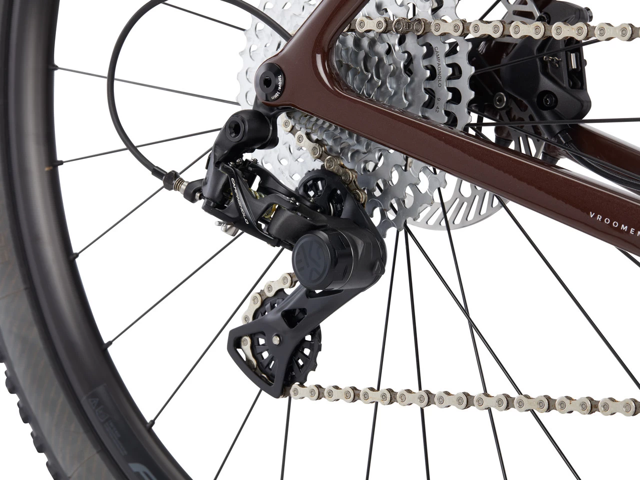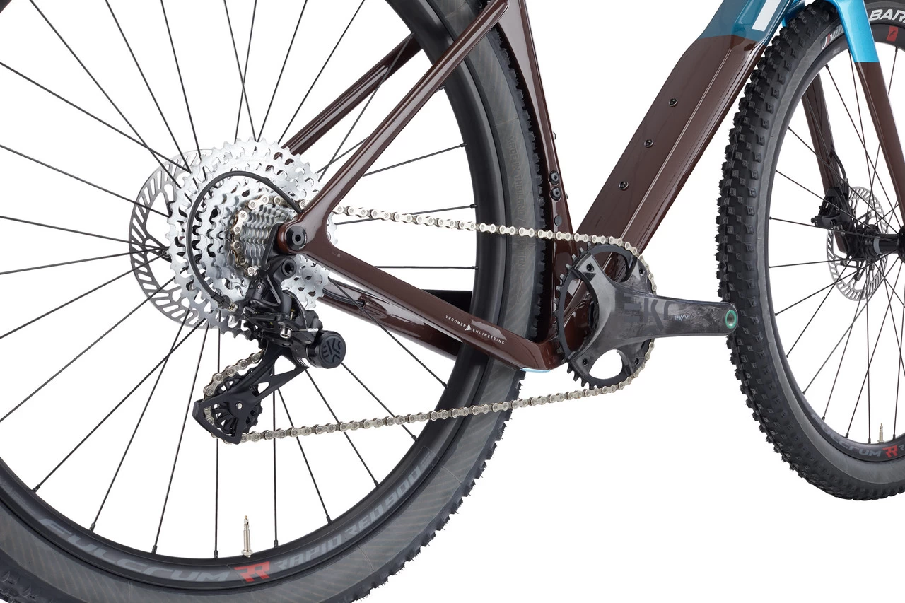 The Exploro Race gravel bike from 3T is made of carbon and is equipped with the Campagnolo Ekar 13-speed groupset and 27.5″ wheels. In addition to 57 mm wide tyres for rough terrain, it has an extra-wide down tube and an extremely narrow head tube. Together with the aero seatpost and a narrow fork crown, the bike is all-around very aerodynamic. The wide steerer tube and the chainstays, which are lowered on both sides, provide sufficient stability.