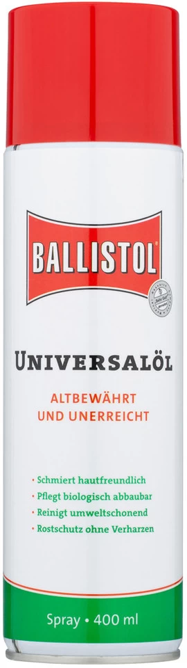 Awards:Ballistol is absolutely skin-friendly and was tested by Dermatest with an end result of ” Very Good” .The magazine ” selbst ist der Mann” reports in issue no. 7 / July 2013 about Ballistol Universal Oil. ” Tried it myself” awarded this oil 5 hammers out of 5.Features:maintains, lubricates, disinfects, protects against rustcreeps into the finest corners, is glide-activedoes not form resin, is completely biodegradablefood safe, skin friendly and completely harmlessthe secret ingredient for DIYers, industry and tradecleans chains, suspension forks and Bowden cablesideal for wintering and restoringperfectly suitable for cleaning and care of Fox and RockShox suspension forksManufacturer Numbers:50 ml:21450200 ml:21700400 ml:21810Contents:1 x Ballistol Universal Oil Spray