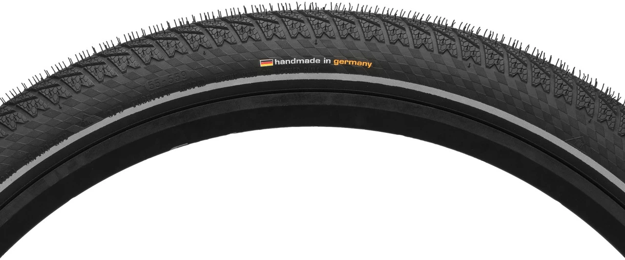 These tyres have a special tread on the sidewall and therefore are particularly suitable for the use of bottle dynamos – the dynamo rolls quietly and doesn’t slip on wet surfaces.