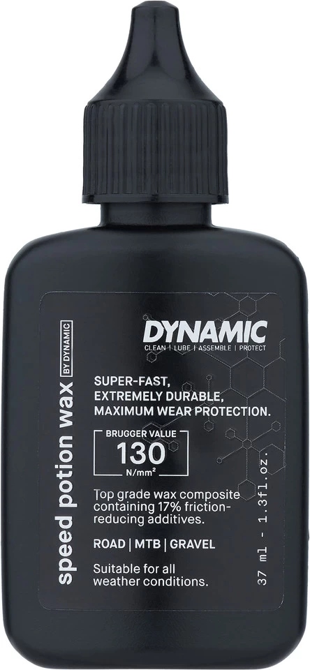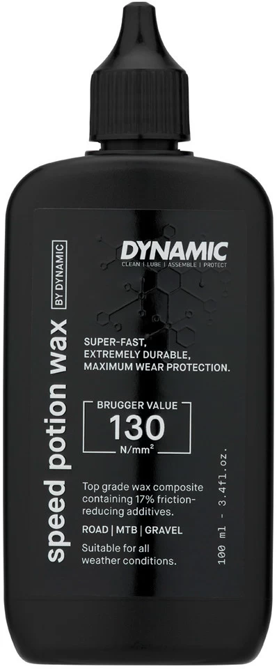 Specifications:Designation:Dynamic Speed Potion Wax DY-002Application:Drivetrain lubricantFeatures:very resilient and suitable for high power outputthe chain remains clean and drylong durability for long maintenance intervalsdeveloped together with professional cyclistsviscosity at 20 °C: mediumBrugger Standard 130 N/mm2Application:clean chain completely and allow to dryshake bottle wellput one drop from the outside and one drop from the inside on each chain linkapply at least two hours before your journey