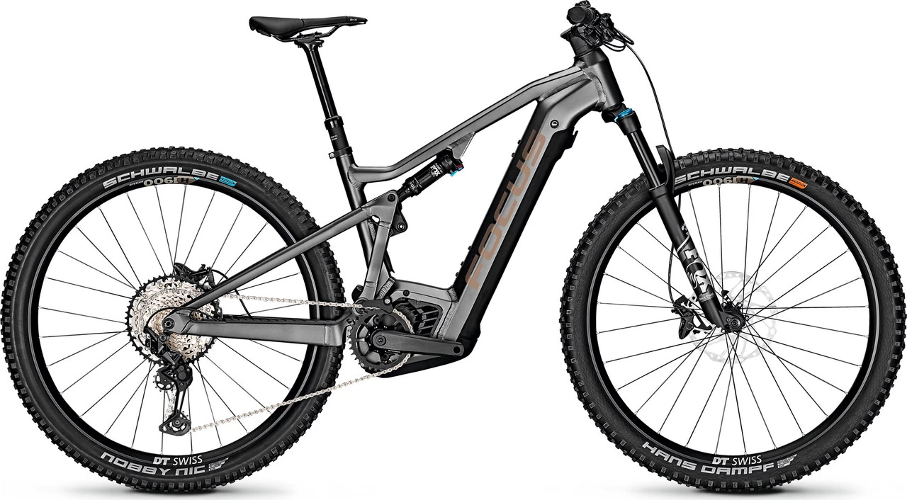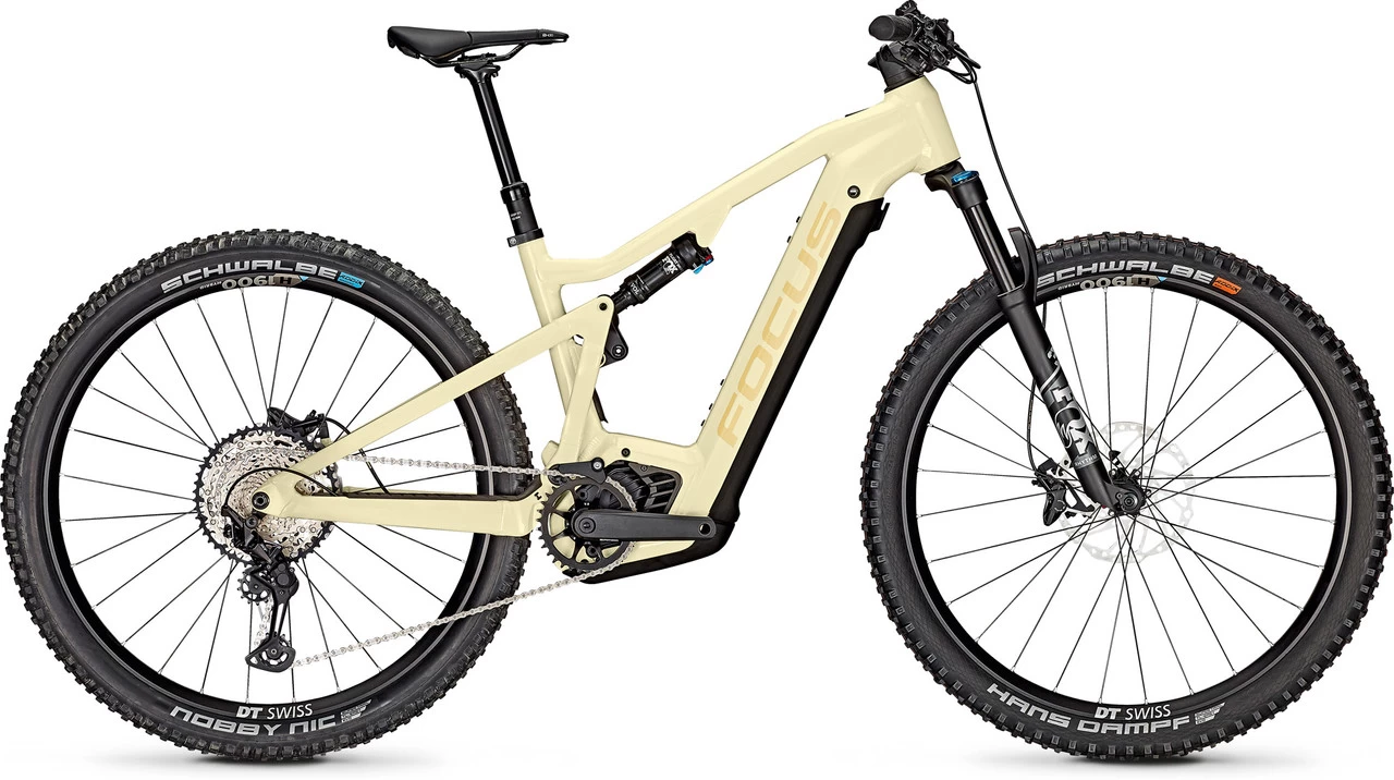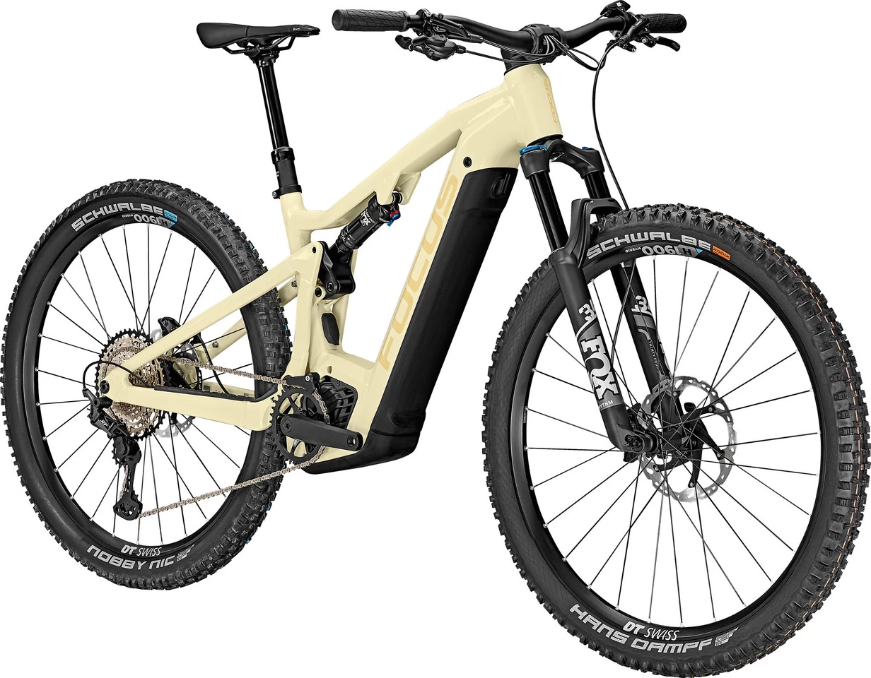 Specifications:Application:All Mountain, Touring, CityWheel Size:29″Front Travel:130 mmRear Travel:130 mmSizes:M, L, XLFront Triangle Material:aluminium (7005)Rear Triangle Material:aluminium (7005)E-Motor:Type:mid-drive motorMotor Type:Bosch Performance CX Smart, 85 NmPedal Assist (max.):25 km/hPower:250 WBattery Type:Bosch Powertube, 36 V, removable, lockableCapacity:750 Wh (20.8 Ah)Display:Bosch LED Remote + Kiox 300Components:Frame:FOCUS THRON², hydroformed aluminium, 3D forged, F.O.L.D. GEN2 linkage design, internal cable routing, C.I.S. technology, USB-C, Postmount 180 mm, 12 x 148 mm thru-axle (Boost)Fork:Fox Racing Shox 34 Float Rhythm 29 E-Bike, Grip Remote, 44 mm offset, 15 x 110 mm (Boost)Stem:FOCUS C.I.S. integrated, aluminium, 0°, 35 mm clampHandlebars:FOCUS, 35 mm rise, 9° backsweepGrips:FOCUSRear Shock:Fox Racing Shox Float DPS, 210 x 50 mm, hardware: 25.0 x 8 mmRemote System:noneHeadset:Acros ZS56/ZS56, FOCUS C.I.S. integratedSeatpost:Post Modern Dropper Post PM-214, 34.9 mm, insertion depth min. 100 mmSaddle:ProximCrank:Samox EC40 ISIS, bottom bracket integrated in motor unit, 34 T chainringPedals:MTB, with reflectorsBrakes:Shimano MT520, hydraulic disc brake, 4 pistons, 203 mm/203 mmShift Lever:Shimano Deore XT SL-M8100, 12-speedRear Derailleur:Shimano Deore XT M8100, 12-speedCassette:Shimano SLX CS-M7100, 12-speed, 10-51 TChain:Shimano SLX CN-M7100, 12-speedRims:DT Swiss H 1900, 30-622Spokes:DT SwissFront Hub:DT Swiss H 1900, 15 x 110 mmRear Hub:DT Swiss H 1900, 12 x 148 mmFront Tyre:Schwalbe Hans Dampf EVO 2.6″ , SuperGround Soft, Tubeless ReadyRear Tyre:Schwalbe Nobby Nic 2.6″ , SuperTrail SpeedGrip, Tubeless ReadyApproved For:Weight Limit:150 kgRotor Size (max.):203 mm (rear)Tyre Size (max.):29 x 2.6″ , with fender: 29 x 2.3″ , 27.5 x 2.75″ (rear wheel)Chainrings:1xChainring Size (max.):1-speed 34 T with 52 mm chainline, 1-speed 36 T with 55 mm chainlineFeatures:versatile pedelec for trails, touring, bikepacking and commutingvery progressively tuned F.O.L.D. linkage design (F.O.L.D. Upgrade)Bosch CX Smart System E-drive and 750 Wh battery for maximum range, removable for charginglarge, easy-to-read Kiox 300 display with ergonomic LED control elementUSB-C connection on the top tube, allowing navigation with smartphone and charging at the same timemore modern geometry than predecessor, revised interior design and external coveringwider inner diameter of 34.9 mm for dropper postsfully integrated cable routing for a tidy cockpit130 mm Fox 34 fork and Float DPS shockShimano XT 1×12-speed drivetrainapproved for bicycle trailers (provided that 150 kg system weight is not exceeded)retrofit options for pannier rack, fenders, kickstand and lightready for operation for Bosch eBike ABSEN classification 3: Bicycle / pedelec for sport and competition rides on trails with moderate technical demands, for impassable trails, uneven unpaved roads as well as undeveloped trails, for jumps and drops up to a maximum of 60 cm, riding skills and practice necessaryTechnology:F.O.L.D. Upgrade / F.O.L.D. Gen2
