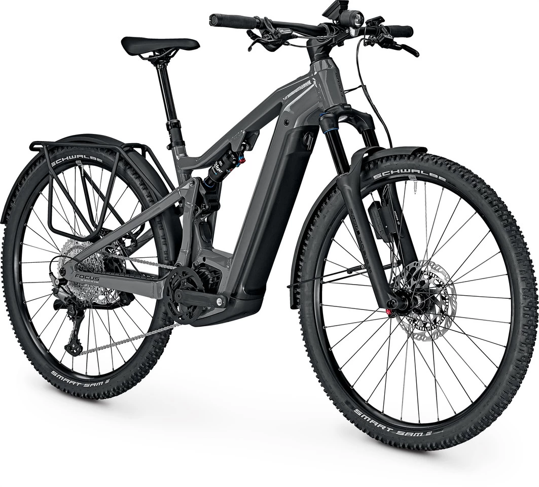 Specifications:Application:All Mountain, Touring, CityWheel Size:29″Front Travel:130 mmRear Travel:130 mmSizes:M, L, XLFront Triangle Material:aluminium (7005)Rear Triangle Material:aluminium (7005)E-Motor:Type:mid-drive motorMotor Type:Bosch Performance CX Smart, 85 NmPedal Assist (max.):25 km/hPower:250 WBattery Type:Bosch Powertube, 36 V, removable, lockableCapacity:750 Wh (20.8 Ah)Display:Bosch LED Remote + Kiox 300Components:Frame:FOCUS THRON², hydroformed aluminium, 3D forged, 130 mm F.O.L.D. GEN2 linkage design, USB-C port, post mount 180 mm, 12 x 148 mm thru-axle (Boost)Fork:SR Suntour MOBIE 35, ABS, 540 mm axle to crown length, 44 mm offset, 15 x 110 mm thru-axle (Boost)Stem:FOCUS C.I.S. integrated, 60 mm 30°, 35 mm handlebar clamp, aluminiumHandlebars:FOCUS, aluminium, 760 mm, flat bar, 9° backsweep, 35 mmGrips:FOCUSRear Shock:SR Suntour Edge, 210 x 50 mm, hardware: 25.0 x 8.0 mm, no bushingRemote System:noneHeadset:Acros ZS56/ZS56 (ICR), FOCUS C.I.S. integratedSeatpost:Post Modern Dropper Post PM-214, 34.9 mmSaddle:Selle Royal VivoCrank:FSA CK-320, aluminium, 170.0 mm, 34 T, bottom bracket integrated in motor unitPedals:MTB, with reflectorsBrakes:Magura CT-ABS, 4 pistons, hydraulic ABS disc brakeShift Lever:Shimano Deore M6100, 12-speedRear Derailleur:Shimano Deore M6100, 12-speedCassette:Shimano Deore CS-M6100, 12-speed, 10-51 TChain:Shimano 12-speedRims:RODI TRYP25, 25-622Spokes:Steel, galvanised, blackFront Hub:Novatec D041, 15 x 110 mmRear Hub:Novatec D462, 12 x 148 mmFront Tyre:Schwalbe Smart Sam, 29 x 2.25″ , 57-622Rear Tyre:Schwalbe Smart Sam, 29 x 2.25″ , 57-622Approved For:Weight Limit:150 kg (system weight)Rotor Size (max.):203 mm (rear)Tyre Size (max.):58-622Chainrings:1xChainring Size (max.):36 TFeatures:touring bike with Bosch Performance CX-E drivetrain and 750-Wh battery for trail riding, bikepacking and commutingEQP version: fully equipped for everyday usealuminium frame with 130 mm travel and revised F.O.L.D. linkage design (Gen2)Suntour MOBIE 130 mm suspension fork and Edge damperadditional safety with Bosch / Magura ABS brake assist, brake lights and high beamsmore controlled, stable braking and improved ride feelfender set from Büchel, aluminium, 60 mm, powder-coatedMassload pannier rack, 3 struts, 25 kg load capacityUrsus rear kickstand, adjustable, 40 mm mountLitemove AE130 front light (high-beam, 130 lux) and Trelock LS421 rear lighttidy cockpit with C.I.S. integrationUSB-C port for charging the smartphone or navigation systemEN classification 2: Bicycle / pedelec for leisure riding with moderate effort, for paved surfaces and unpaved roads or gravel paths of moderate difficulty, drops of no more than 15 cm, average speed 15 to 25 km/hTechnology:F.O.L.D. Upgrade / F.O.L.D. Gen2