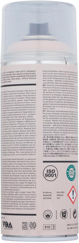 Manufacturer’s Warning:Optimum ambient temperature while spraying: 20-25°C. Do not use Spray.Bike at outside temperatures below 10°C, above 35°C or at a relative humidity level greater than 75%. Keep the can well-protected from sunlight and ambient temperatures above 50°C/122°F.CLP Regulation Label: