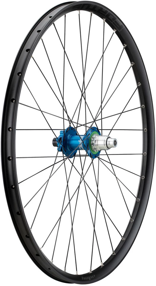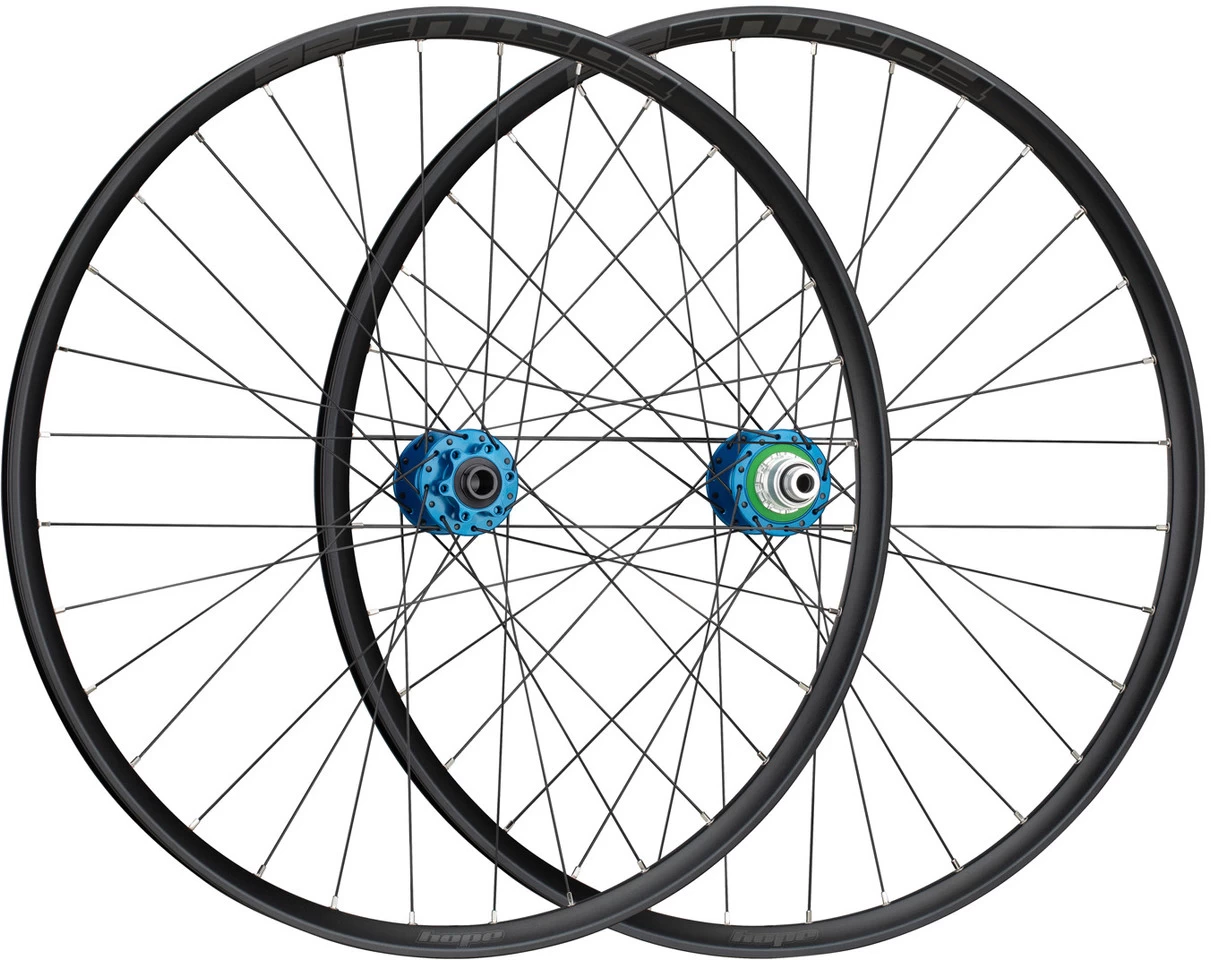 Note:The shipping time for wheels with coloured hubs (all colours except black) can take up to 8 weeks.Specifications:Application:EnduroWheel Size:29″Tyre Type:clincher tyreNumber of Spokes:32Brake Type:6-bolt discTubeless System:Tubeless ReadyTechnical Information – Rim:Type:Hope FortusDimensions (ETRTO):26-622Inner Width:26 mmOuter Width:31 mmDepth:20 mmERD:600 mmValve Hole Diameter:SV / Presta (6.5 mm)Rim Material:aluminium (6061-T6)Technical Information – Front Hub:Type:Hope Pro 4Over Locknut Dimension:15 x 100 mm thru-axleBearings:cartridge, stainless steel (sealed)Body Material:aluminium (2014-T6)Technical Information – Rear Hub:Type:Hope Pro 4Over Locknut Dimension:10 x 135 mm quick release, can be converted to 12 x 142 mm thru-axleBearings:cartridge, stainless steel (sealed)Body Material:aluminium (2014-T6)Freehub Body Material:aluminiumFreehub Body:ratchet system (4 pawls) w/ 44 tooth engagement (8.2°)Technical Information – Lacing:Front Lacing Pattern:3-crossRear Lacing Pattern:3-crossSpoke Type:Sapim Race / J-bend / double buttedSpoke Size:291 mm/292 mm (front wheel l/r), 292 mm/291 mm (rear wheel l/r)Spoke Material:stainless steelNipple Material:brassApproved For:Air Pressure (max.):4.1 barRecommended Tyre Width:2.25″ – 2.5″Features:wider rim than the Tech wheelstable and stiff, but weight optimized (580 g rim only)rim eyeletslarger flange diameter on hub bodyWaterslide decalsmachine made and hand finished in Barnoldswick (UK)tubeless tape and valves required for tubeless setup (incl.)Colour Index:The first component of the colour indicates the hub, the second the rim (always black). The decals are black (stealth), the spokes black, the nipples silver.