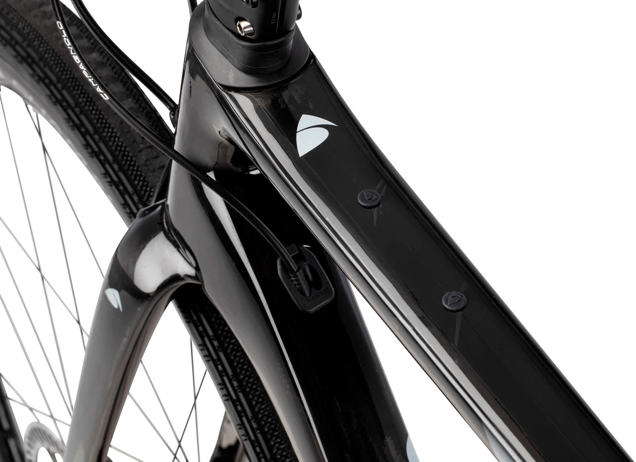 The 950 g lightweight carbon frame forms the basis for a competition-oriented gravel bike. The aggressive geometry of the bike and optimal stiffness values impress with effortless handling that lets you adapt quickly to changing surfaces, gravel roads and potholes. The relatively small wheelbase maintains manoeuvrability off-road. The larger outer diameter of the 700C gravel tyres is compensated by the lowered bottom bracket, which gives it an optimal position. The defined seat tube angle and the linearity of the stack-reach ratio give riders of all body sizes a perfect fit.