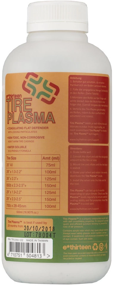 The Tire Plasma by e*thirteen has a unique composition with self-crosslinking acrylic resin based platelets. It is designed to quickly and efficiently seal tears and holes up to four millimetres in size. A loss of pressure in your tyre is kept as low as possible and you can continue riding. Due to the special composition, neither the sidewalls of your tyres nor the environment are affected. Under certain circumstances, the self-crosslinking properties of the sealant may cause increased flacking. Therefore, e*thirteen recommends filling the sealant directly into the tyre. The Tire plasma is free of ammonia.