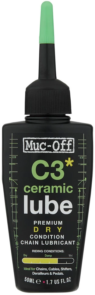 Specifications:Designation:Muc-Off C3 DRY Ceramic LubeApplication:LubricantFeatures:ceramic lubricant with nanoparticles and synthetic polymersglows under UV lightshines in dry, dusty and humid conditionsideal for cyclocross, MTB and roadincredible durability for long distancesbiodegradablefree from mineral oilfrom natural, renewable resourcesHazardous Substance:Not required.