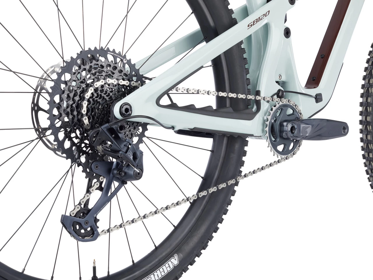 Specifications:Application:Cross CountryWheel Size:29″Front Travel:130 mmRear Travel:120 mmSizes:M, LFront Triangle Material:Carbon (C/Series)Rear Triangle Material:Carbon (C/Series)Components:Frame:Yeti Cycles SB120, 12 x 148 mm (Boost)Fork:Fox Racing Shox 34 Performance, 44 mm offsetStem:Burgtec Enduro MK3, 35 mm clamp, 50 mm lengthHandlebars:Burgtec Ride Wide Alloy Enduro, 35 mm clamp, 780 mm lengthGrips:ODI Elite ProRear Shock:Fox Racing Shox Float DPS Performance, 190 x 45 mmRemote System:noneHeadset:Cane Creek 40 integratedSeatpost:OneUp Components, 31.6 mm, 180 mm stroke (M), 210 mm stroke (L)Saddle:WTB Silverado CustomCrank:SRAM GX Eagle, 170.0 mm, with 30 T chainring and SRAM DUB BSA73 bottom bracketPedals:noneBrakes:SRAM G2 R, 4 pistons, with SRAM Centerline brake rotors 180 mm (front) / 180 mm (rear)Shift Lever:SRAM GX Eagle, 12-speedRear Derailleur:SRAM GX Eagle, 12-speedCassette:SRAM GX Eagle XG-1275, 12-speed 10-52 teethChain:SRAM GX Eagle, 12-speedRims:crankbrothers Systhesis Enduro, 30 mmSpokes:crankbrothersFront Hub:crankbrothersRear Hub:crankbrothersFront Tyre:Maxxis Minion DHF EXO, 29 x 2.5″Rear Tyre:Maxxis Aggressor EXO, 29 x 2,3″Approved For:Rotor Size (max.):203 mm (rear)Tyre Size (max.):29 x 2.6″Chainrings:1xChainring Size (max.):for SRAM/Shimano Boost cranks with 55 mm chainline: 1-speed 34 teeth (round), 1-speed 32 teeth (oval)Fork Axle to Crown Size (max.):564 mmFeatures:carbon cross-country bike with Fox Performance suspension and SRAM GX Eagle rear derailleurstrong, stiff C/Series carboncompletely internal cable routing without rattling and chafing with secure cable exitsbolted bottom bracket with ISCG-05 mount for a chain guideSRAM UDH universal derailleur hanger for easy replacementcompact one-piece Wishbone Shock Extender allows easy handling of the shock and positions it further forwardpatented Switch Infinity Link technologysealed Enduro Max pivot bearings in standard sizesrather linear progression curve for predictable behavioursize-specific geometry and carbon composition25 mm more ground clearance on the down tube than on the SB115rather short seat tube for high freedom of movement, allows long-stroke seatpostsneutral seat positionagile handlingwith chainstay and downtube protectionspace for a bottle in the frame triangleTechnology:Switch Infinity Link