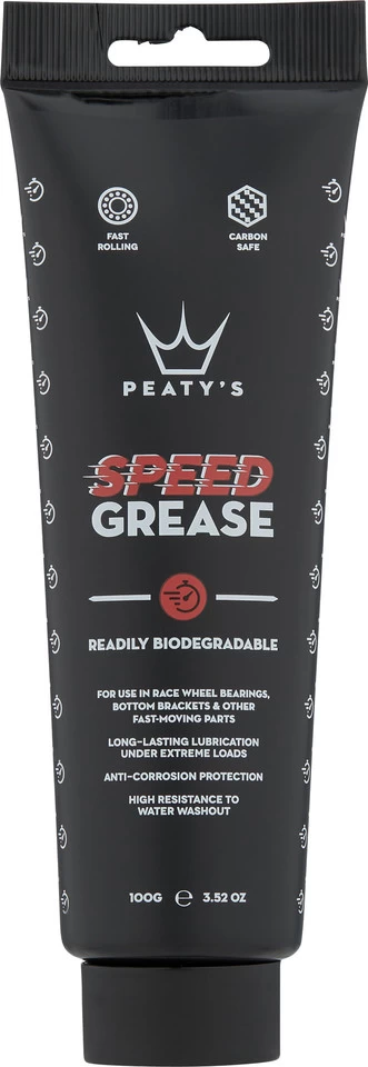 Specifications:Designation:Peaty’s Speed GreaseApplication:LubricantFeatures:bearing grease based on synthetic esters for the lubrication of fast-moving parts such as hubs and inner bearingsdistributes evenly across metal surfacesreduced friction between treated componentsgood water resistancelong-lasting corrosion protectionharmless for carbon partswith M15 thread for screwing on a grease gunbiodegradableNote from the manufacturer:Peaty’s Speed Grease is compatible with all oils, mineral or synthetic, with the exception of PAG (polyalkylene glycol) based products.