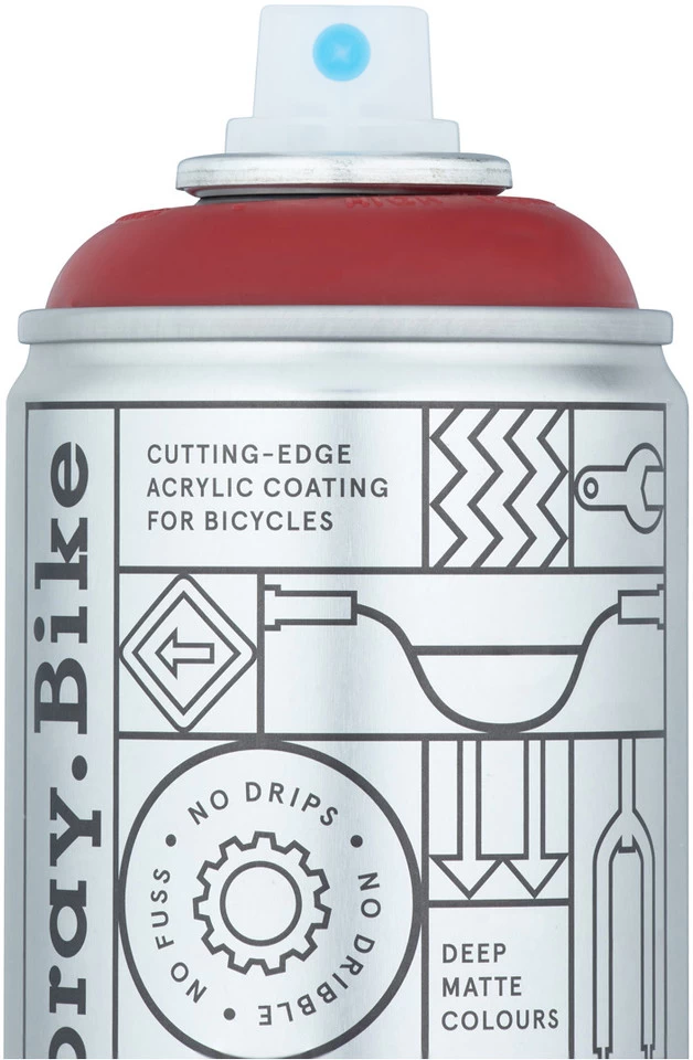 Specifications:Designation:Spray Bike Acrylic Paint in AerosolApplication Area:frame, fork and all parts to be paintedFeatures:acrylic paint mixture with very high coverage: deep, matte coloursdry powder coating with innovative anti-drip formulacan be used without primerideally suitable for steel, aluminium and carbonUV-resistantcolour transitions, stencil and fade effects easy to dono subsequent heat treatment necessarywith 400 ml a common bicycle incl. fork can be treated with one layerApplication:use Spray.Bike only on clean, dry surfaceswear gloves, protective clothing and breathing maskalways paint outdoorsshake spray can vigorously for approx. 3 minutes before usetake 2-3 test sprays before usespray holding the can ONLY at a vertical angle, from a 5 – 12 cm distancekeep the spray can moving at all times during the spraying processallow to dry before applying another coat of paint (approx. 2 hours)allow the paint to dry completely before assembling the bike (approx. 12 hours)for best results, polish paint carefully with a lint-free cloth approx. 2 hours after spraying