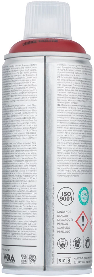 Manufacturer’s Warning:Optimum ambient temperature while spraying: 20-25°C. Do not use Spray.Bike at outside temperatures below 10°C, above 35°C or at a relative humidity level greater than 75%. Keep the can well-protected from sunlight and ambient temperatures above 50°C/122°F.CLP Regulation Label: