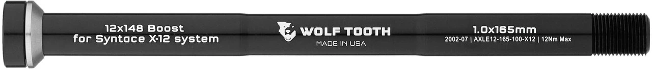 Specifications:Over Locknut Dimension:rear: 142 mm, 148 mmAxle Diameter:Rear: 12 mmTechnical Information:Use:rear: 12 x 142 mm, 12 x 148 mmType:thru-axleAxle Material:aluminium (7075-T6)Axle Length:159 mm (12 x 142 mm), 165 mm (12 x 148 mm)Nominal Diameter:M12Thread Pitch:1.0Thread Length:12 mmCompatibility:Syntace 12 mm rear thru-axle systems (X-12)Features:with fixed conical stainless steel washer, protects the forkstiffer interface, protection against jamming5 and 6 mm hex fittingnon-Boost and Boost versionMade in the USA